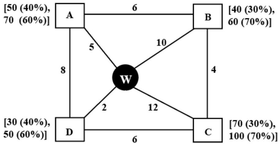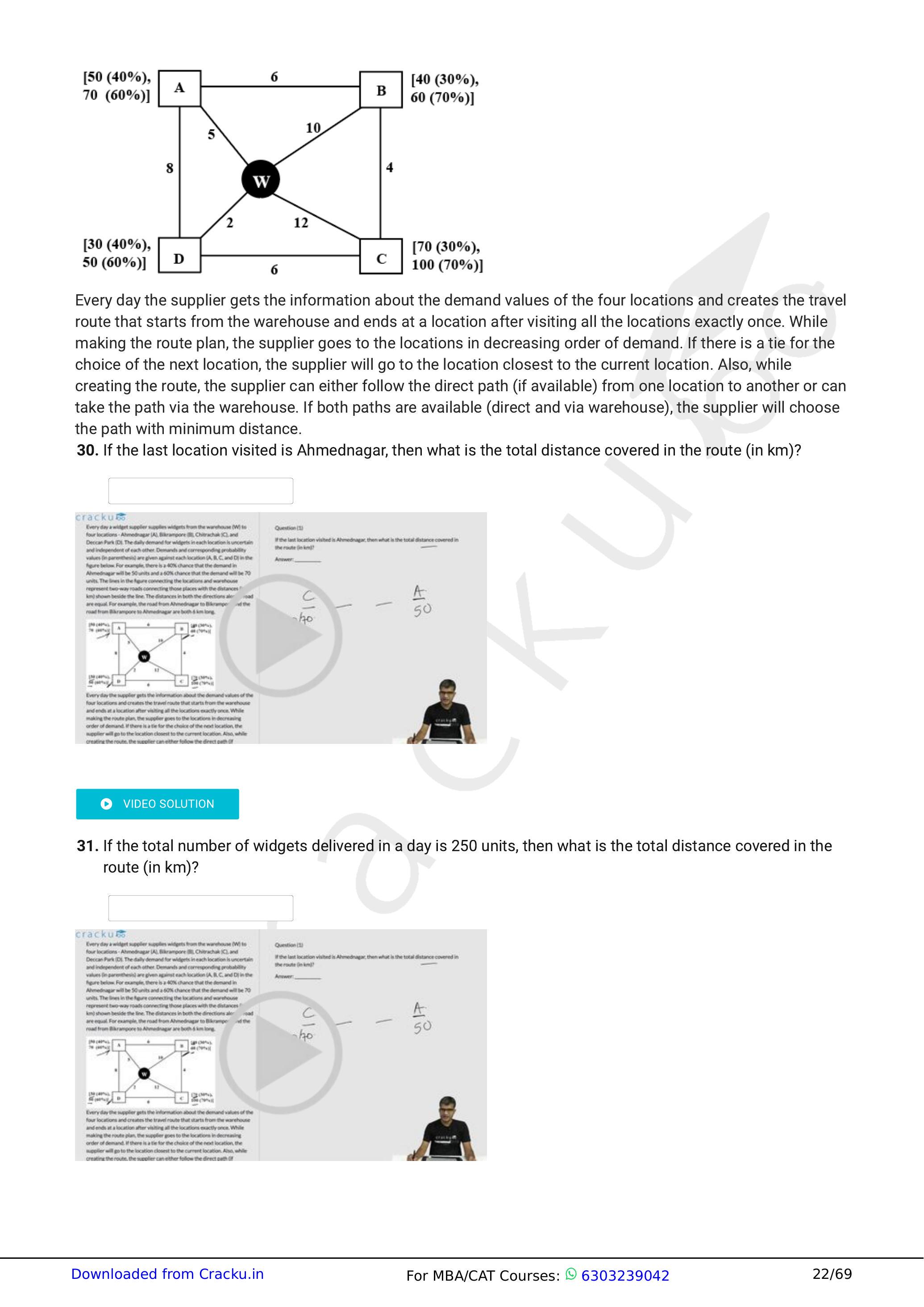 Every day a widget supplier supplies widgets from the warehouse ( W ) to four locations - Ahmednagar (A), Bikrampore (B), Chitrachak (C), and Deccan Park (D). The daily demand for widgets in each location is uncertain and independent of each other. Demands and corresponding probability values (in parenthesis) are given against each location ( , and ) in the figure below. For example, there is a chance that the demand in Ahmednagar will be 50 units and a chance that the demand will be 70 units. The lines in the figure connecting the locations and warehouse represent two-way roads connecting those places with the distances (in km ) shown beside the line. The distances in both the directions along a road are equal. For example, the road from Ahmednagar to Bikrampore and the road from Bikrampore to Ahmednagar are both 6 km long.