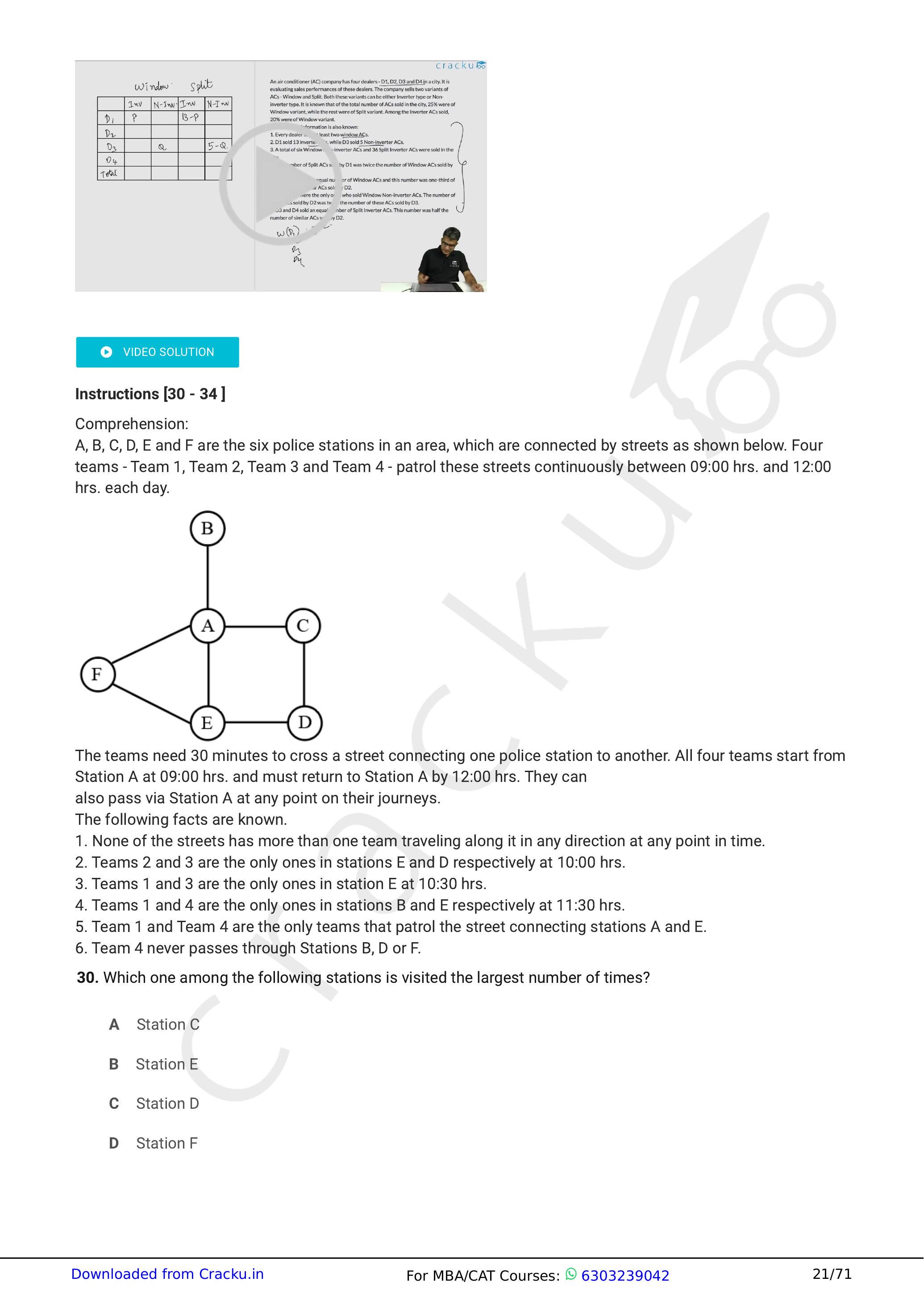and F are the six police stations in an area, which are connected by streets as shown below. Four teams - Team 1, Team 2, Team 3 and Team 4 - patrol these streets continuously between 09:00 hrs. and 12:00 hrs. each day.