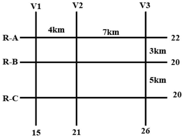 The figure below shows a network with three parallel roads represented by horizontal lines R-A, R-B, and R-C and another three parallel roads represented by vertical lines , and V 3 . The figure also shows the distance (in km ) between two adjacent intersections.