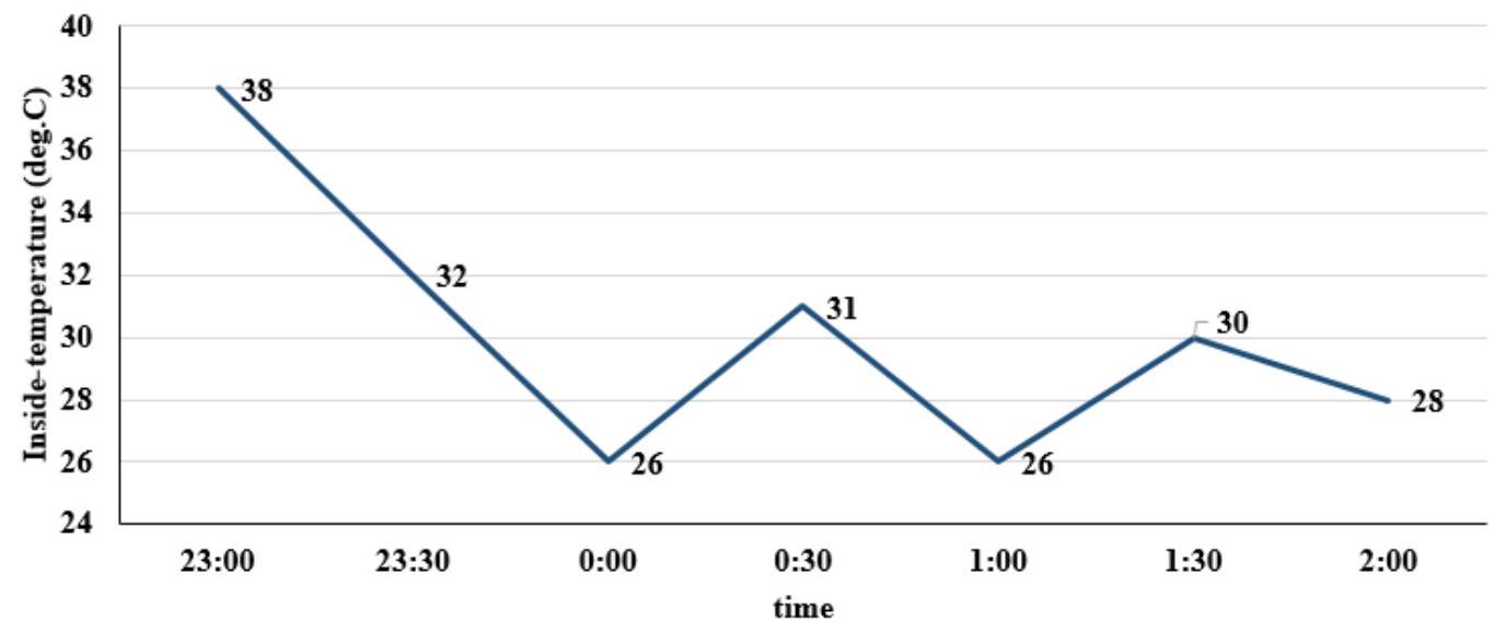 What was the maximum difference between temperature outside and inside temperature, in degree Celsius, between 11:01 pm and 1:59 am?