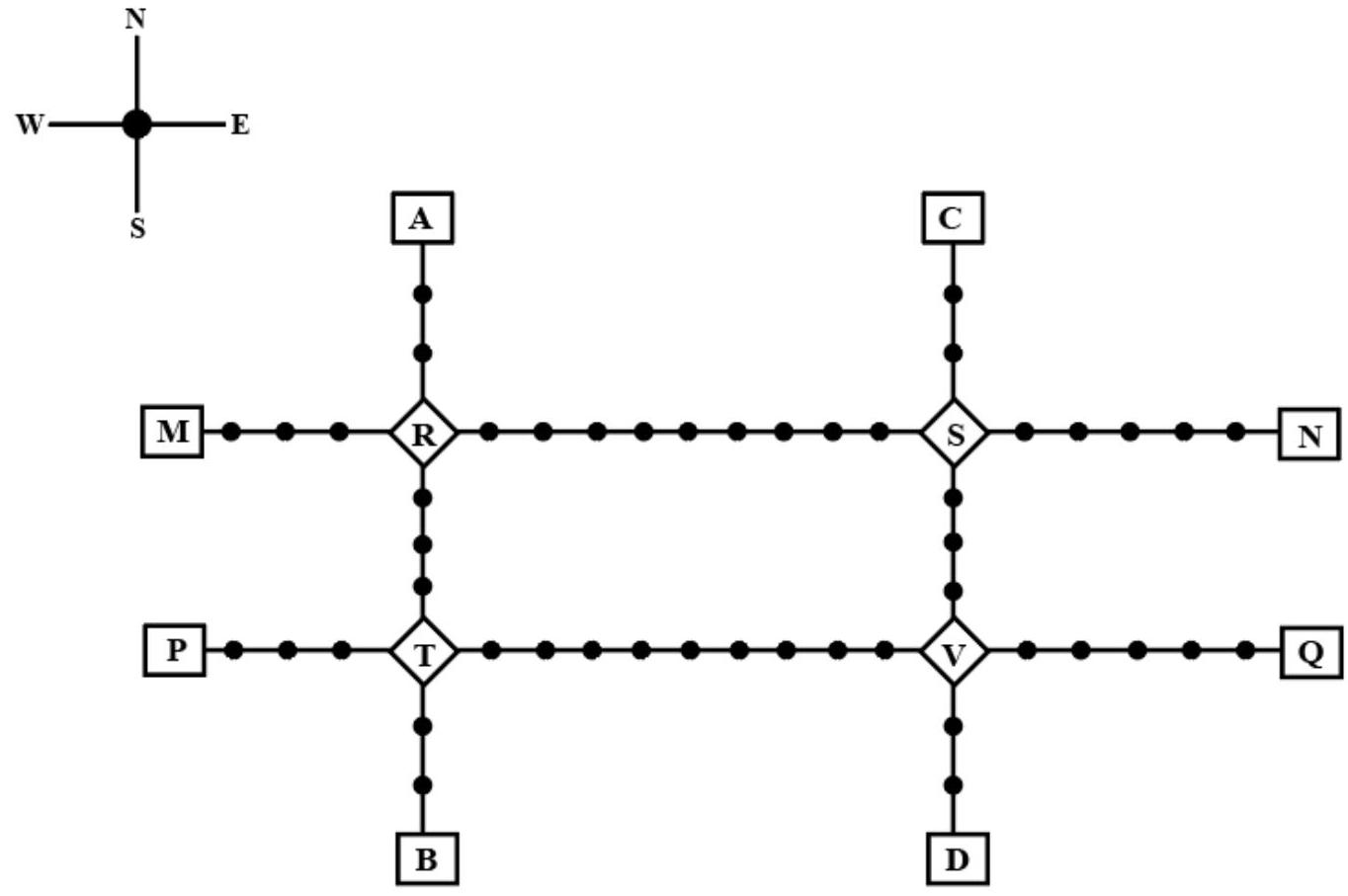 Given above is the schematic map of the metro lines in a city with rectangles denoting terminal stations (e.g. A), diamonds denoting junction stations (e.g. R) and small filled-up circles denoting other stations. Each train runs either in east-west or north-south direction, but not both. All trains stop for 2 minutes at each of the junction stations on the way and for 1 minute at each of the other stations. It takes 2 minutes to reach the next station for trains going in east-west direction and 3 minutes to reach the next station for trains going in northsouth direction. From each terminal station, the first train starts at 6 am; the last trains leave the terminal stations at midnight. Otherwise, during the service hours, there are metro service every 15 minutes in the northsouth lines and every 10 minutes in the east-west lines. A train must rest for at least 15 minutes after completing a trip at the terminal station, before it can undertake the next trip in the reverse direction. (All questions are related to this metro service only. Assume that if someone reaches a station exactly at the time a train is supposed to leave, (s)he can catch that train.)