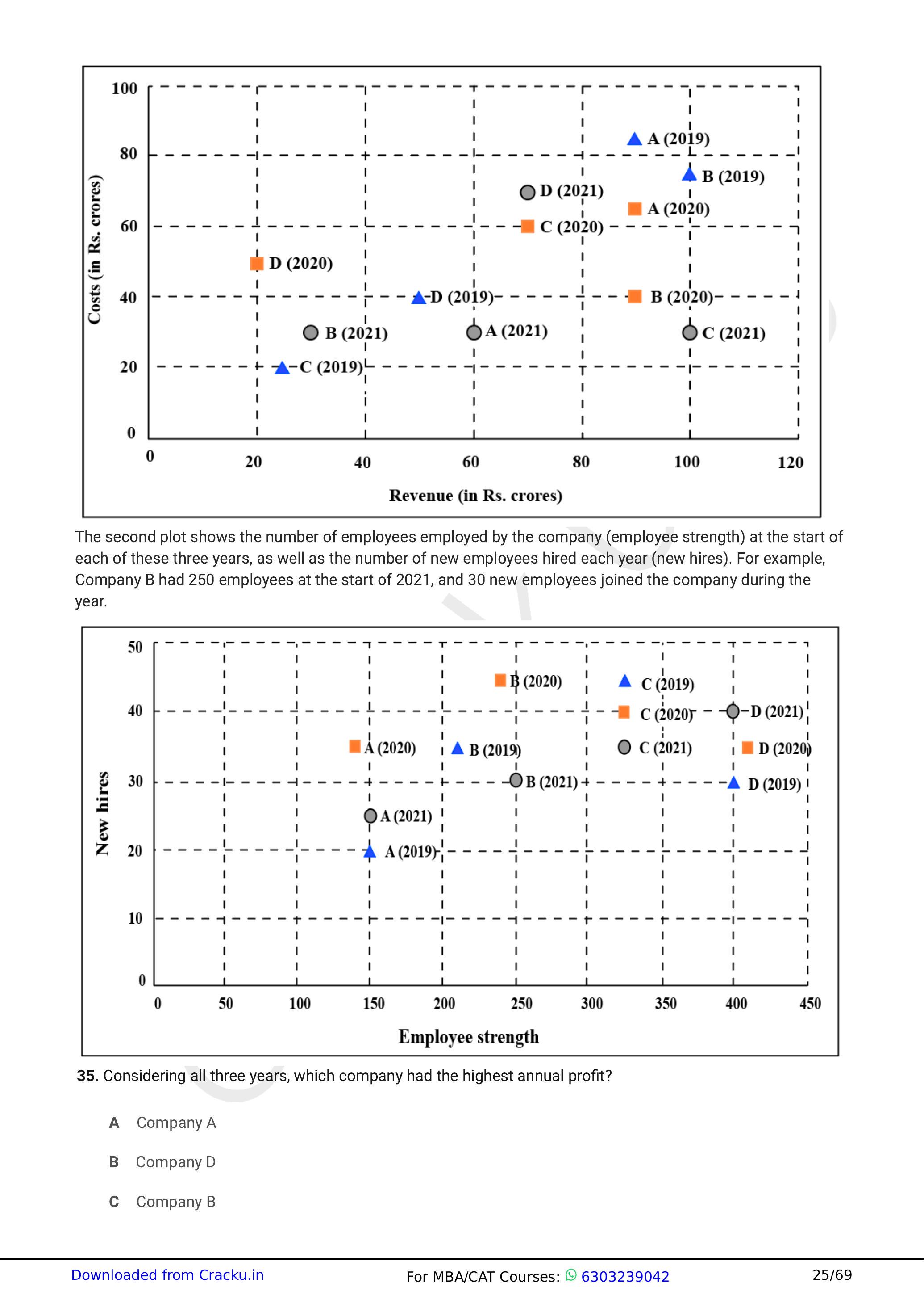 The two plots below show data for four companies code-named A, B, C, and D over three years - 2019, 2020, and 2021.