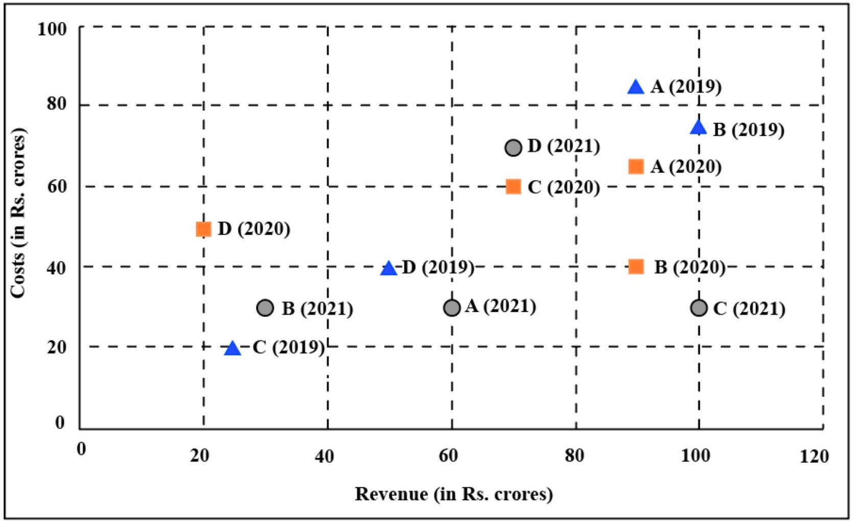 The first plot shows the revenues and costs incurred by the companies during these years. For example, in 2021, company C earned Rs. 100 crores in revenue and spent Rs. 30 crores. The profit of a company is defined as its revenue minus its costs.