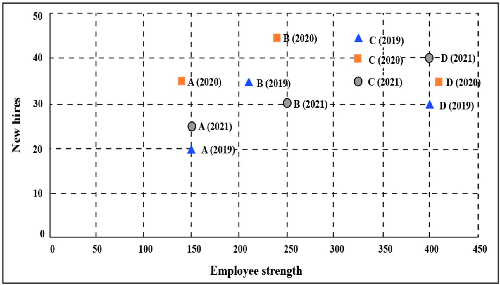 The second plot shows the number of employees employed by the company (employee strength) at the start of each of these three years, as well as the number of new employees hired each year (new hires). For example, Company B had 250 employees at the start of 2021, and 30 new employees joined the company during the year.