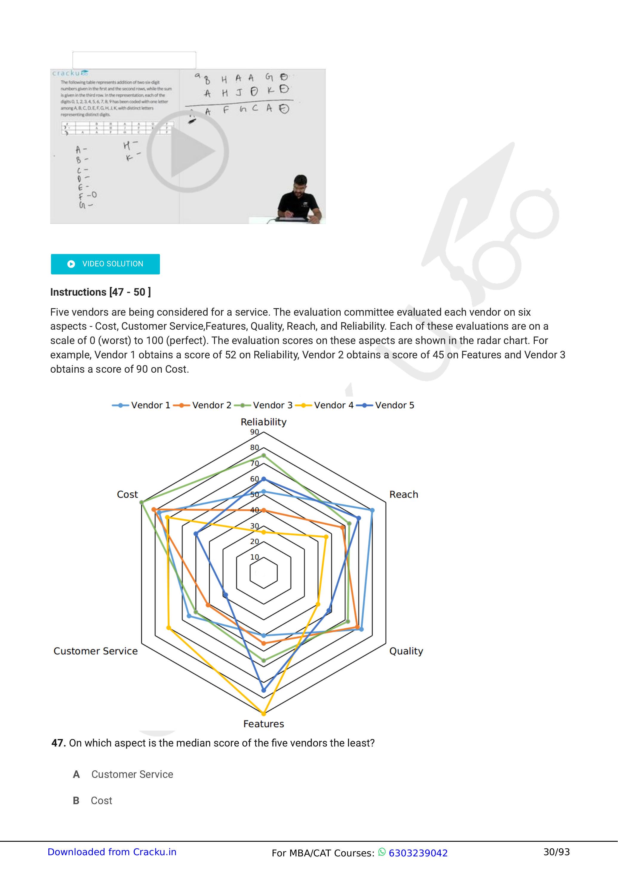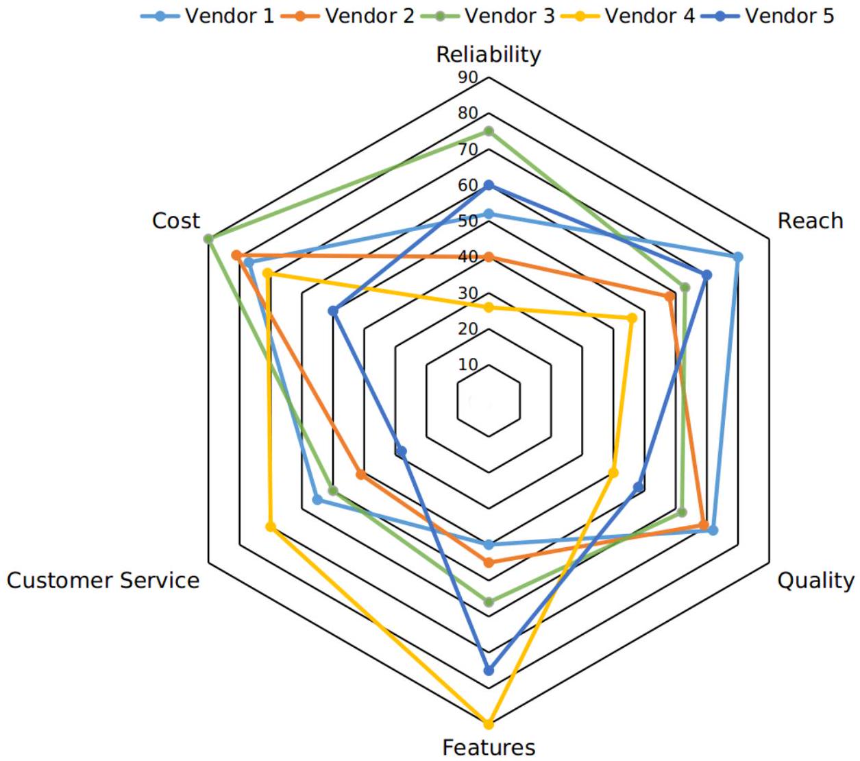 Five vendors are being considered for a service. The evaluation committee evaluated each vendor on six aspects - Cost, Customer Service,Features, Quality, Reach, and Reliability. Each of these evaluations are on a scale of 0 (worst) to 100 (perfect). The evaluation scores on these aspects are shown in the radar chart. For example, Vendor 1 obtains a score of 52 on Reliability, Vendor 2 obtains a score of 45 on Features and Vendor 3 obtains a score of 90 on Cost.