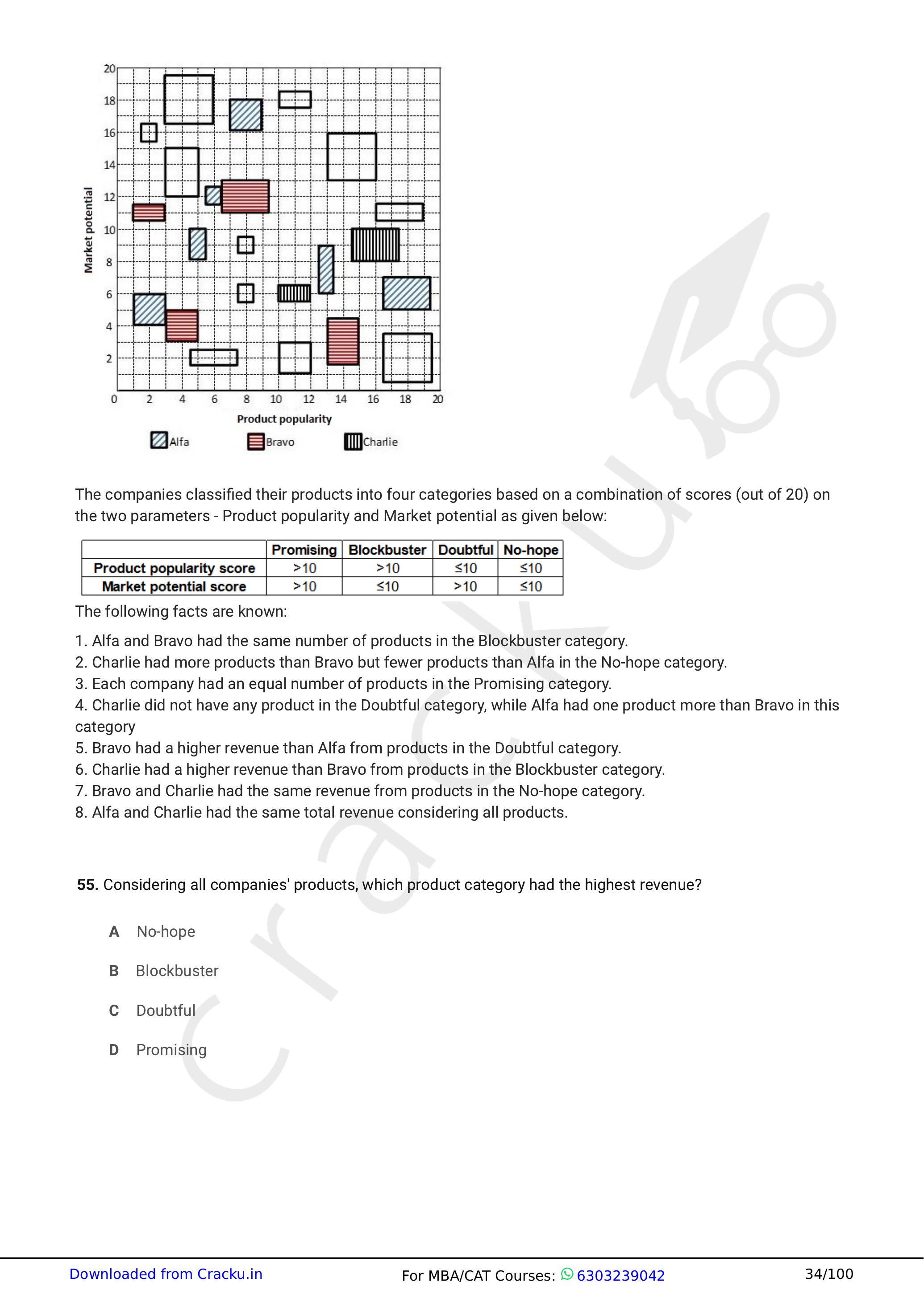 The companies classified their products into four categories based on a combination of scores (out of 20 ) on the two parameters - Product popularity and Market potential as given below: