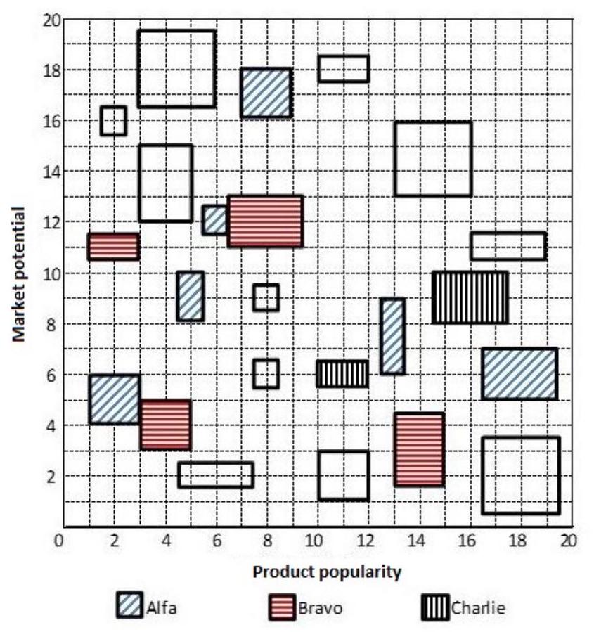 Each of the 23 boxes in the picture below represents a product manufactured by one of the following three companies: Alfa, Bravo and Charlie. The area of a box is proportional to the revenue from the corresponding product, while its centre represents the Product popularity and Market potential scores of the product (out of 20). The shadings of some of the boxes have got erased.