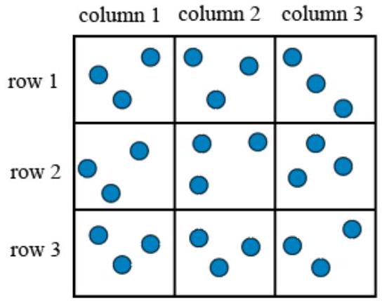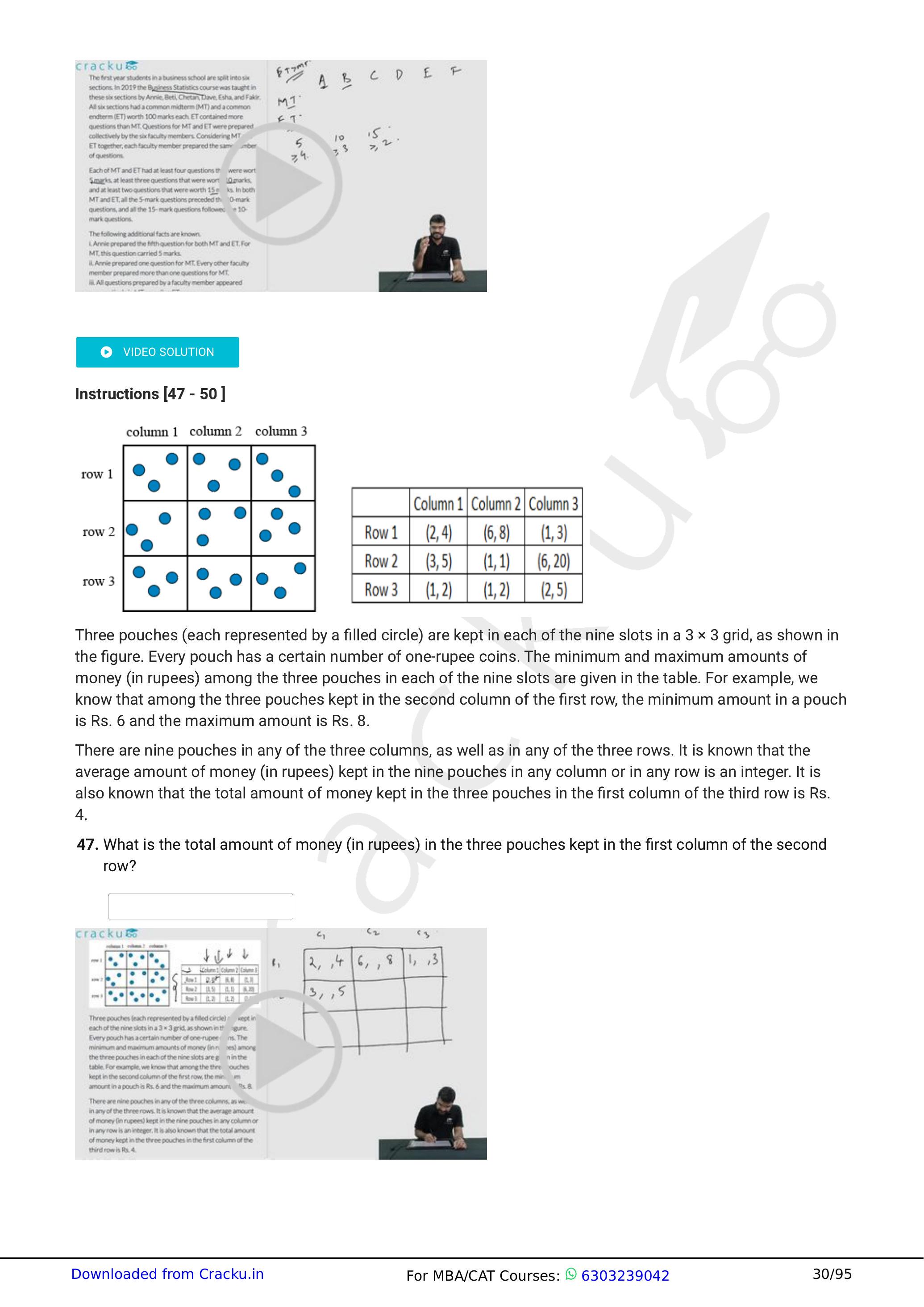 Three pouches (each represented by a filled circle) are kept in each of the nine slots in a grid, as shown in the figure. Every pouch has a certain number of one-rupee coins. The minimum and maximum amounts of money (in rupees) among the three pouches in each of the nine slots are given in the table. For example, we know that among the three pouches kept in the second column of the first row, the minimum amount in a pouch is Rs. 6 and the maximum amount is Rs. 8.