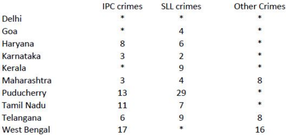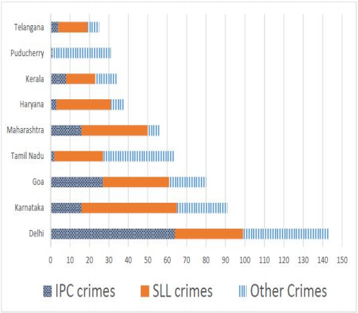 The number of cases - classified into three categories: IPC crimes, SLL crimes and other crimes - for nine states/UTs are shown in the figure below. These nine belong to the top ten states/UTs in terms of the total number of cases registered. The remaining state (among top ten) is West Bengal, where all the 520 cases registered were SLL crimes.