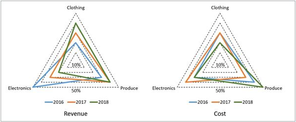 A large store has only three departments, Clothing, Produce, and Electronics. The following figure shows the percentages of revenue and cost from the three departments for the years 2016, 2017 and 2018. The dotted lines depict percentage levels. So for example, in 2016, 50% of store's revenue came from its Electronics department while of its costs were incurred in the Produce department